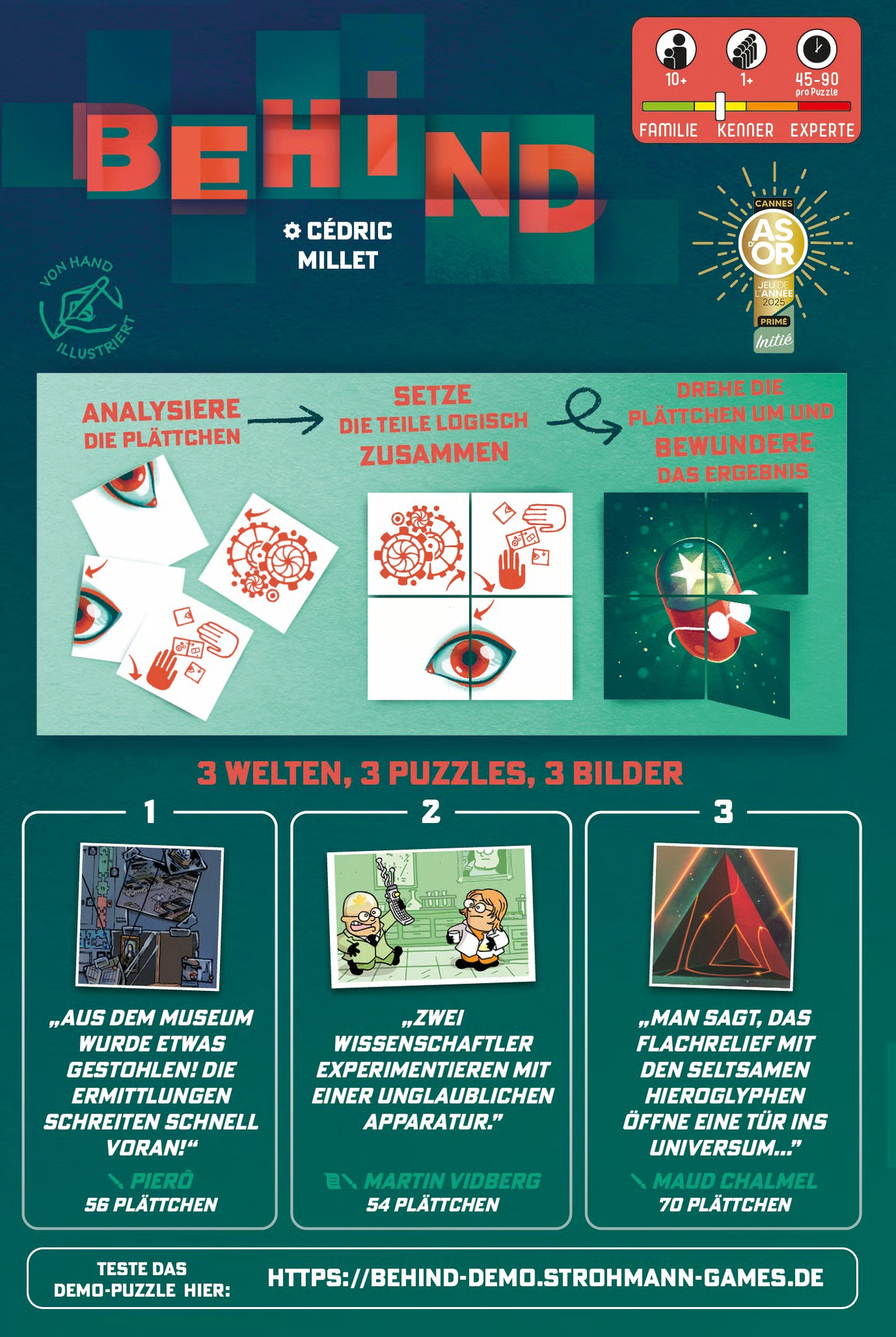 In Behind arbeitet ihr zusammen, um die in viele einzelne Fragmente aufgeteilte Szene auf der Vorderseite der Plättchen wieder herzustellen. Dafür müsst ihr die Plättchen zuerst analysieren und sie dann auf logische Art und Weise zusammenfügen. Wenn ihr fertig seid, dreht sie um. Bestenfalls könnt ihr die Illustration auf der Rückseite bewundern.