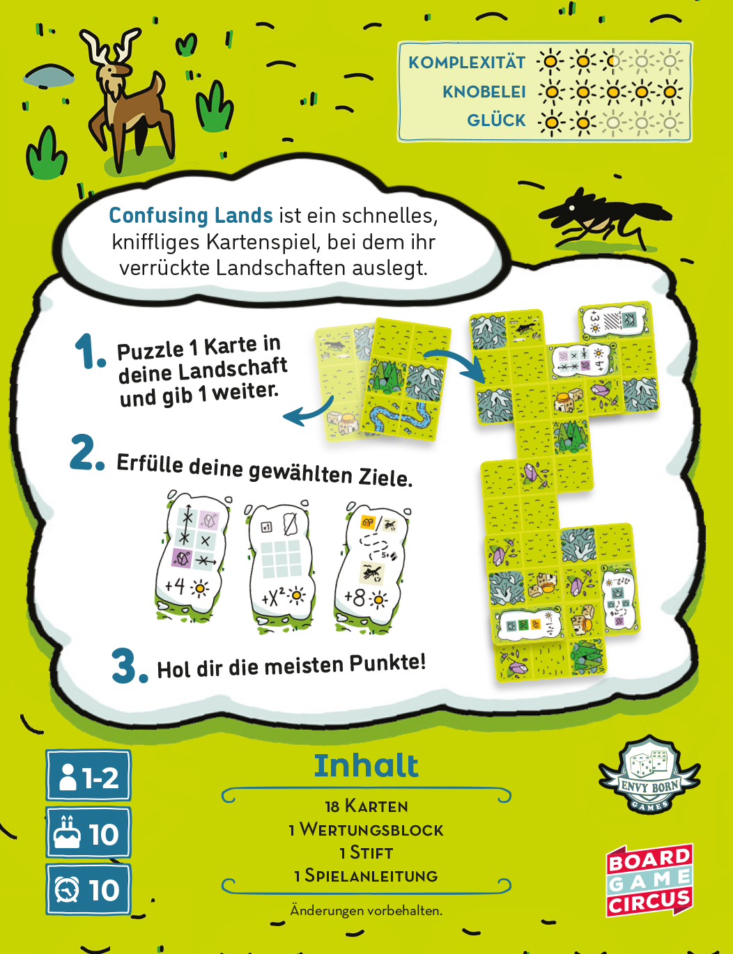 Confusing Lands ist ein schnelles und kniffliges Kartenspiel, bei dem ihr verrückte Landschaften erschafft. Ob allein oder zu zweitwählt geschickt Karten aus und legt sie in eure Landschaft, um die meisten Punkte zu sammeln. Confusing Lands ist das perfekte Spiel für alle Fans von knobeligen und schnellen Legespielen, wie Obsthain und Hermit. Trotz der kurzen Spielzeit und schlanken Anleitung kommt ihr bestimmt ganz schön ins Grübeln, wie ihr die meisten Punkte machen könnt.