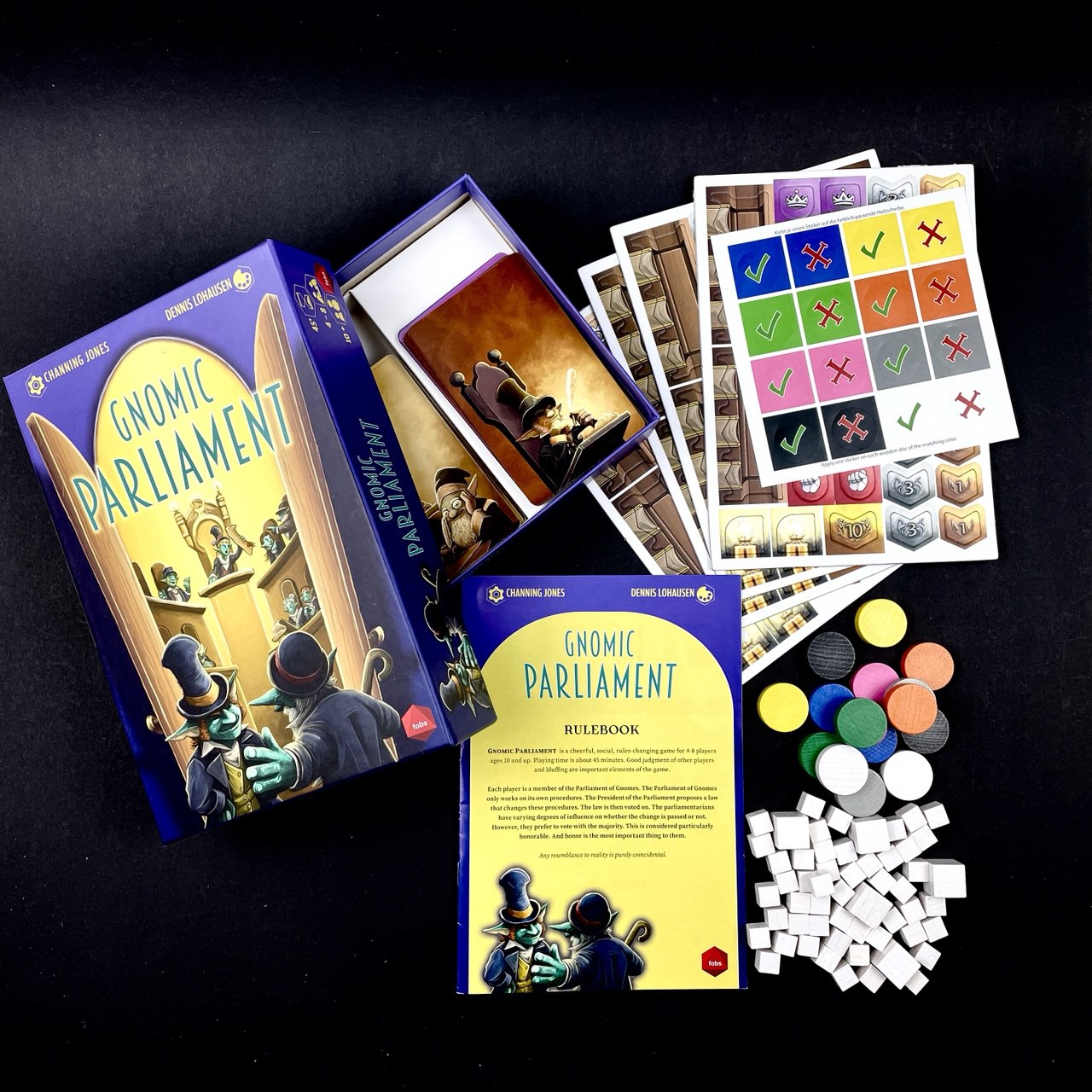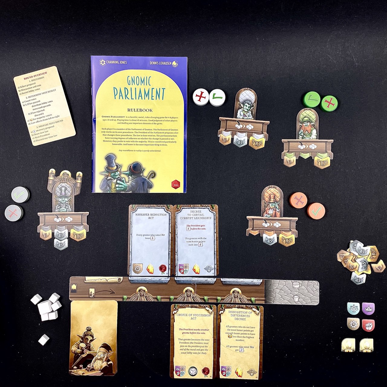 Each player is a member of the Parliament of Gnomes. The Parliament of Gnomes only works on its own procedures. The President of the Parliament proposes a law that changes these procedures. The law is then voted on. The parliamentarians have varying degrees of influence on whether the change is passed or not. However, they prefer to vote with the majority. This is considered particularly honorable. And honor is the most important thing for them.