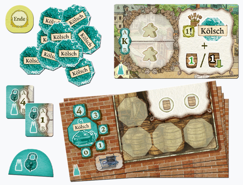Mit der Kölsch-Erweiterung erhalten 2–4 Spieler:innen eine zusätzliche Mini-Brauerei samt eigenem Kessel, Fasslager und Keller. Das Modul bringt nicht nur eine neue Biersorte ins Spiel, sondern auch exklusive Aktionskarten, Kölsch-spezifische Aufträge und ein neues Aktionsplättchen „K“.