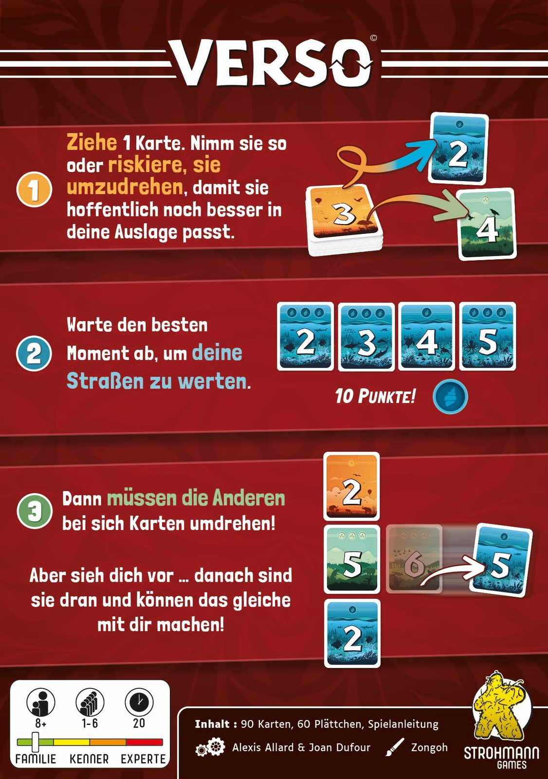 Verso ist ein sehr interaktives kurzweiliges Push Your Luck und Set Collection Spiel, bei dem Timing gefordert ist. Möchte ich lieber meine Auslage ausbauen oder werte ich doch lieber meine Karten, um den anderen zuvorzukommen?!