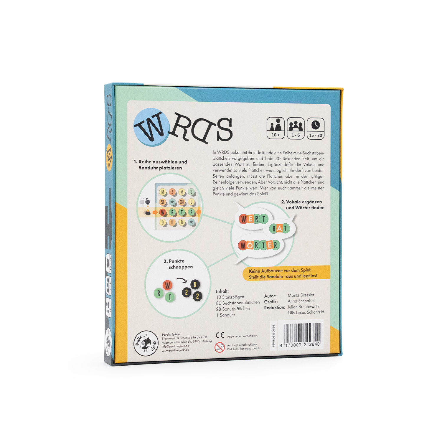 In WRDS (gesprochen „Words“) bekommst du jede Runde eine Reihe mit 4 Buchstabenplättchen vorgegeben und 30 Sekunden Zeit, um dir ein passendes Wort zu überlegen. Ergänze dafür die Vokale und verwende so viele Plättchen wie möglich. Du darfst von beiden Seiten anfangen, musst die Plättchen jedoch in der richtigen Reihenfolge verwenden. Aber Vorsicht, nicht alle Plättchen sind gleich viele Punkte wert. Wer von euch sammelt die meisten Punkte und gewinnt das Spiel?